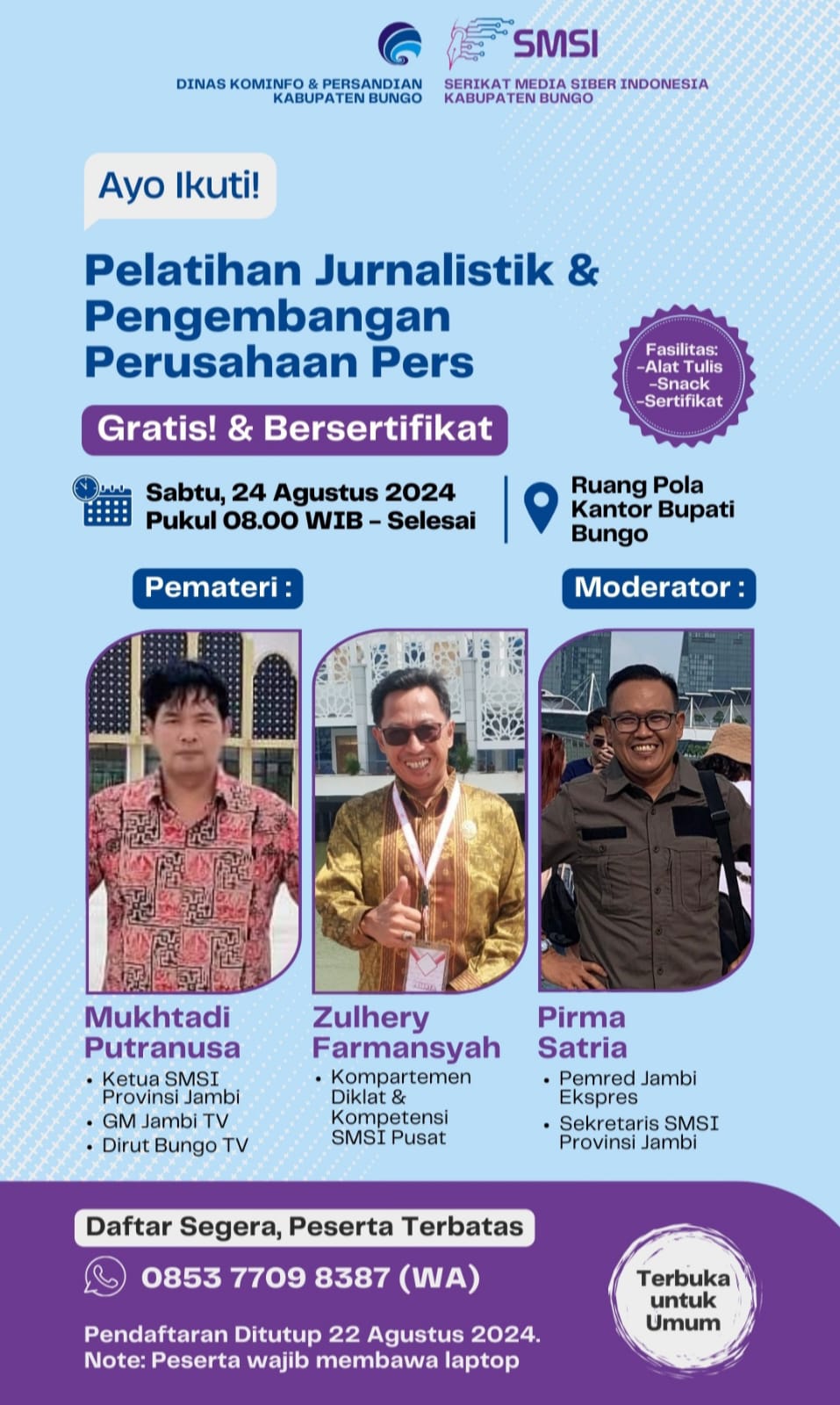 “Pesertanya terbatas maksimal 100 orang peserta, Pemateri dan penguji kami datangkan langsung dari Provinsi Jambi yang berkompeten dibidangnya, semoga acara ini lancar dan bisa bermanfaat bagi peserta juga kepada jurnalis yang ikut dalam pelatihan nanti,.”tambah Ilham.Redaksi