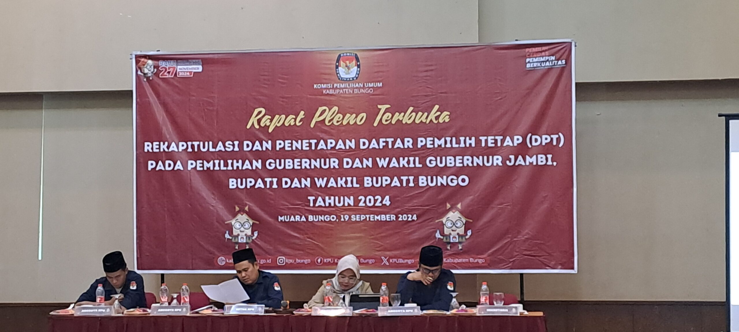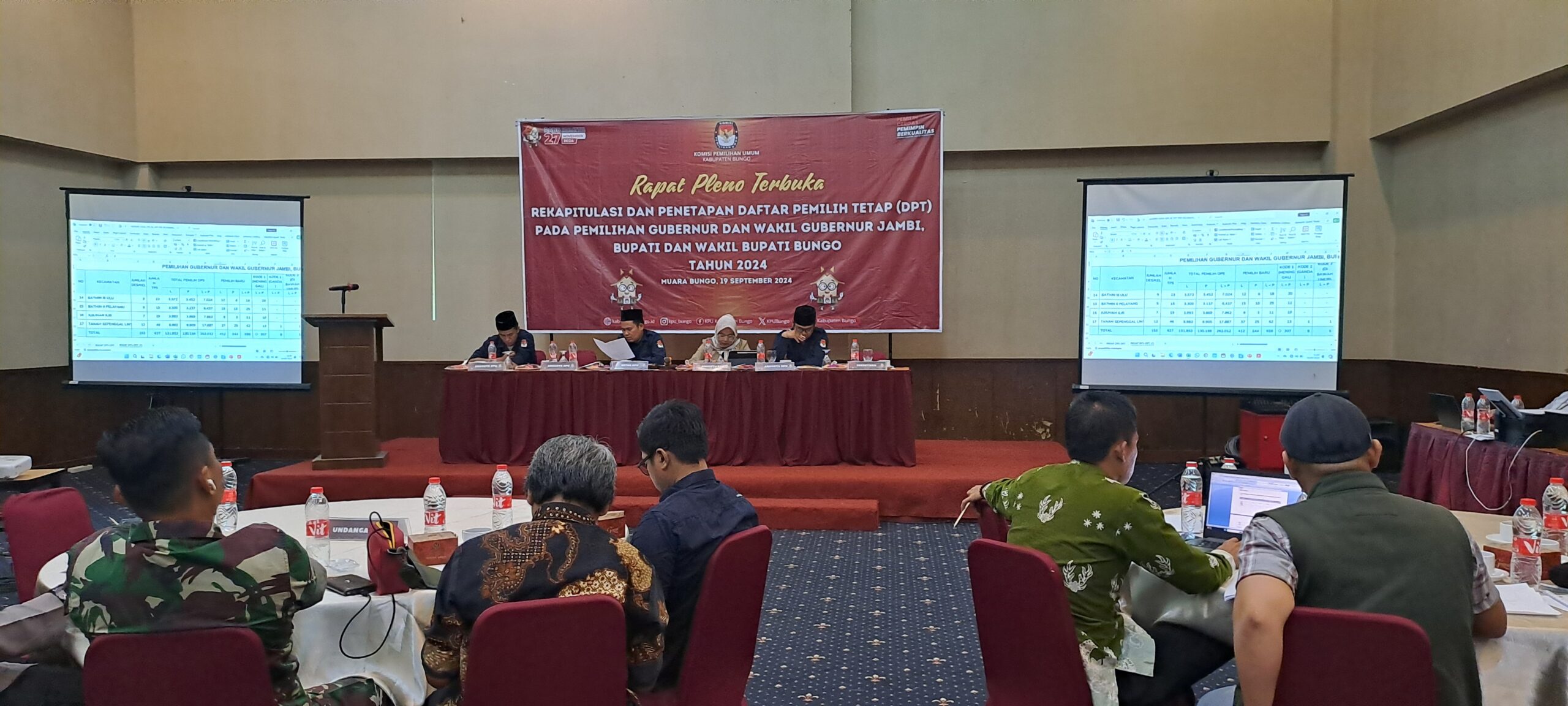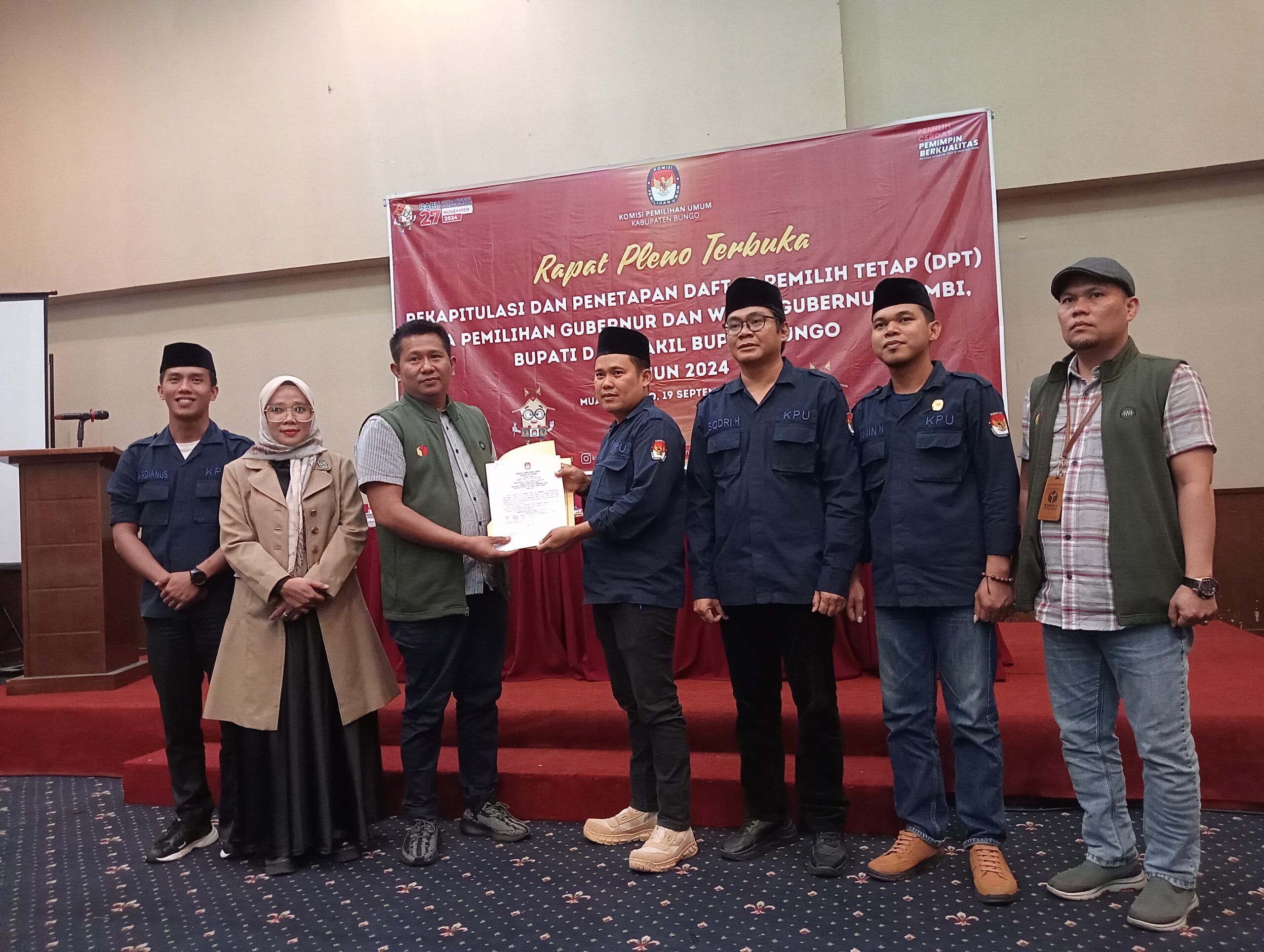 Kabarredaksi.id – Muara Bungo -Kamis (19/9) Komisi Pemilihan Umum (KPU) Kabupaten Bungo resmi menetapkan Daftar Pemilih Tetap (DPT) dalam rapat pleno terbuka yang digelar di salah satu hotel di Muara Bungo. Penetapan DPT ini dilakukan dalam rangka pemilihan gubernur, wakil gubernur Jambi, serta bupati dan wakil bupati Bungo yang akan berlangsung serentak pada tanggal 27 November mendatang.