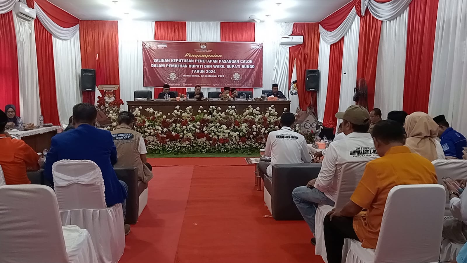 pada Senin (23/9/2024) pukul 10.00 WIB akan dilakukan tahapan pengundian dan penetapan nomor urut pasangan calon Bupati dan Wakil Bupati di Kantor KPU Bungo.