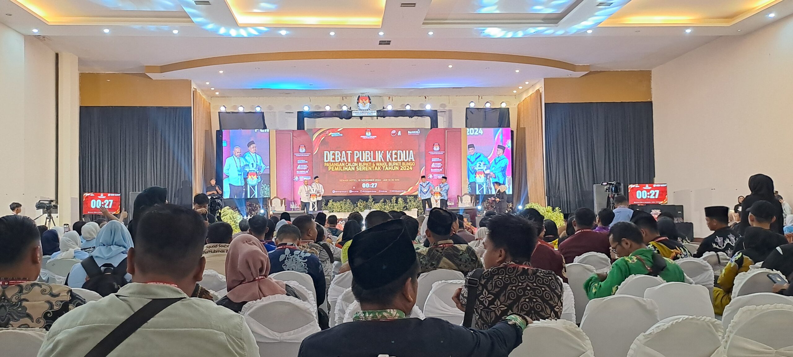 Kabarredaksi.id-Muara Bungo – Antusias pendukung para pasangan calon Bupati dan Wakil Bupati Kabupaten Bungo menghadiri acara debat publik kedua Pilkada Bungo 2024 dan masyarakat yang menyaksikan secara langsung di media televisi. Kegiatan ini yang diselenggarakan oleh Komisi Pemilihan Umum (KPU) Bungo.