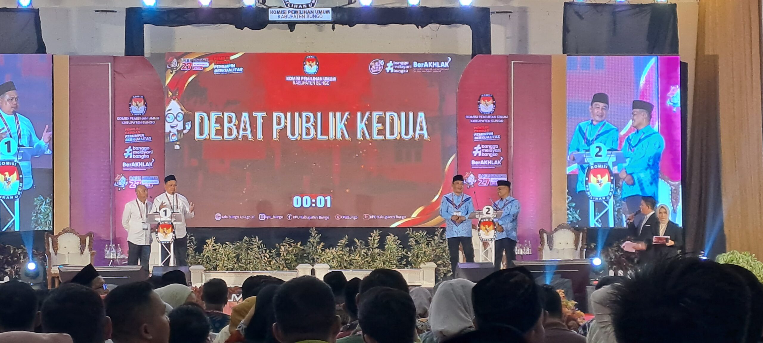 Kabarredaksi.id-Muara Bungo – Antusias pendukung para pasangan calon Bupati dan Wakil Bupati Kabupaten Bungo menghadiri acara debat publik kedua Pilkada Bungo 2024 dan masyarakat yang menyaksikan secara langsung di media televisi. Kegiatan ini yang diselenggarakan oleh Komisi Pemilihan Umum (KPU) Bungo.
