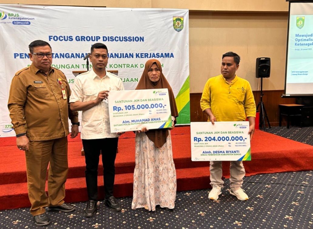 Kabarredaksi.id -Muara Bungo – Sebagai upaya meningkatkan jumlah peserta BPJS Ketenagakerjaan di Kabupaten Bungo, Bupati Bungo H. Mashuri.S.P.M.E melalui Sekretaris Daerah Drs Mursidi.,M.M membuka secara resmi acara Forum Group Discussion (FGD) dan penandatanganan perjanjian kerjasama “ Perlindungan tenaga kontrak daerah antara BPJS Ketenaga Kerjaan dengan seluruh OPD Pemerintah Kabupaten Bungo”.