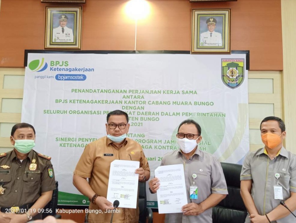 Penandatanganan MOU kerjasama tersebut di tanda tangani oleh Sekda Bungo Drs.Mursidi.,MM dan kepala cabang BPJS Ketenagakerjaan Kabupaten Bungo, bertempat di ruang rapat utama Bupati, Selasa (19/01/2021).Dan diikuti oleh seluruh kepala OPD di Lingkup Kabupaten Bungo.