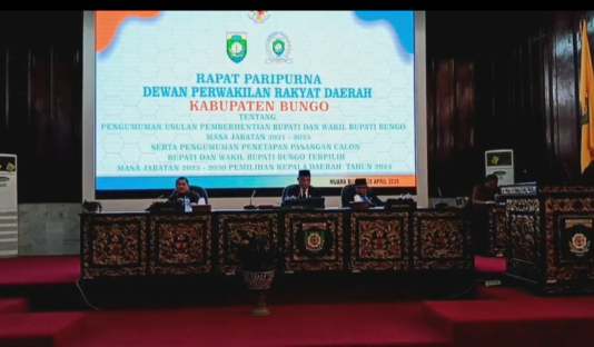 Sementara dalam agenda tersebut paripurna hari ini, Bupati Bungo terpilih H. Dedy Putra, SH,. M.Kn berhalangan hadir dikarenakan berada di luar kota dan diwakilkan kepada Wakil Bupati Bungo terpilih Tri Wahyu Hidayat.