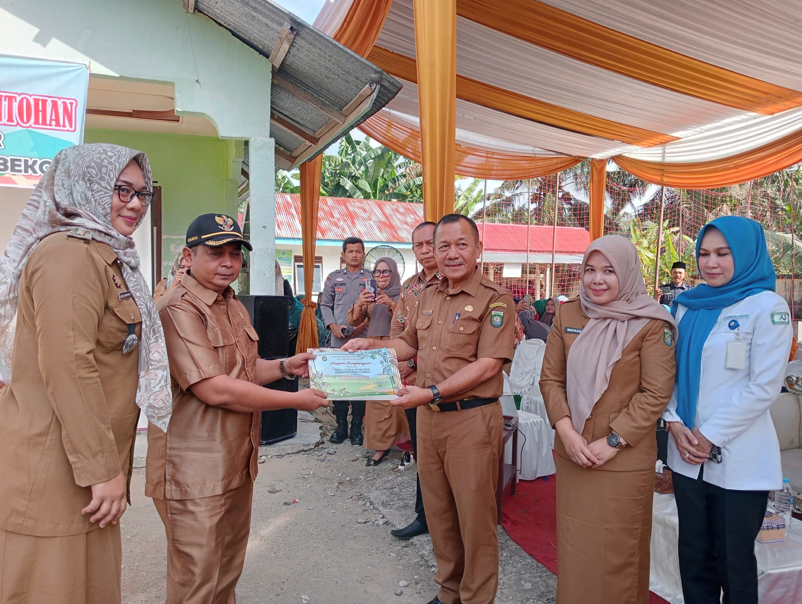 Acara launching desa PHBS percontohan ini ditandai dengan pemberian Piagam Penghargaan kepada Dusun Suka Makmur serta diterima langsung Datuk Rio Suka Makmur.