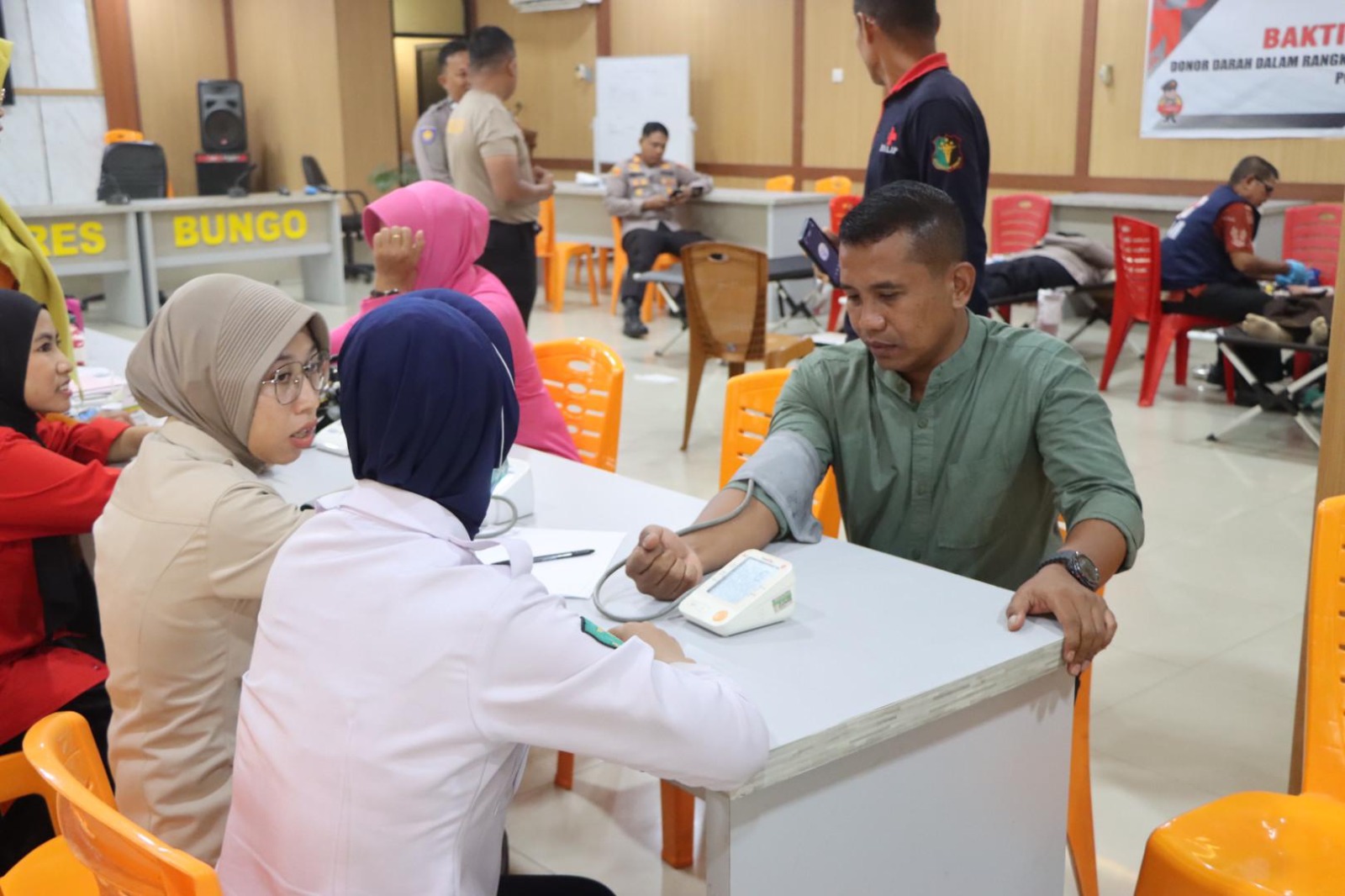 Kegiatan bakti kesehatan berupa donor darah dalam rangka menyambut Hari Bhayangara Ke-79, yang berbeda dari biasanya, karena juga mengajak Bhayangkari dan ASN Polres Bungo agar ikut serta mendonorkan darahnya.