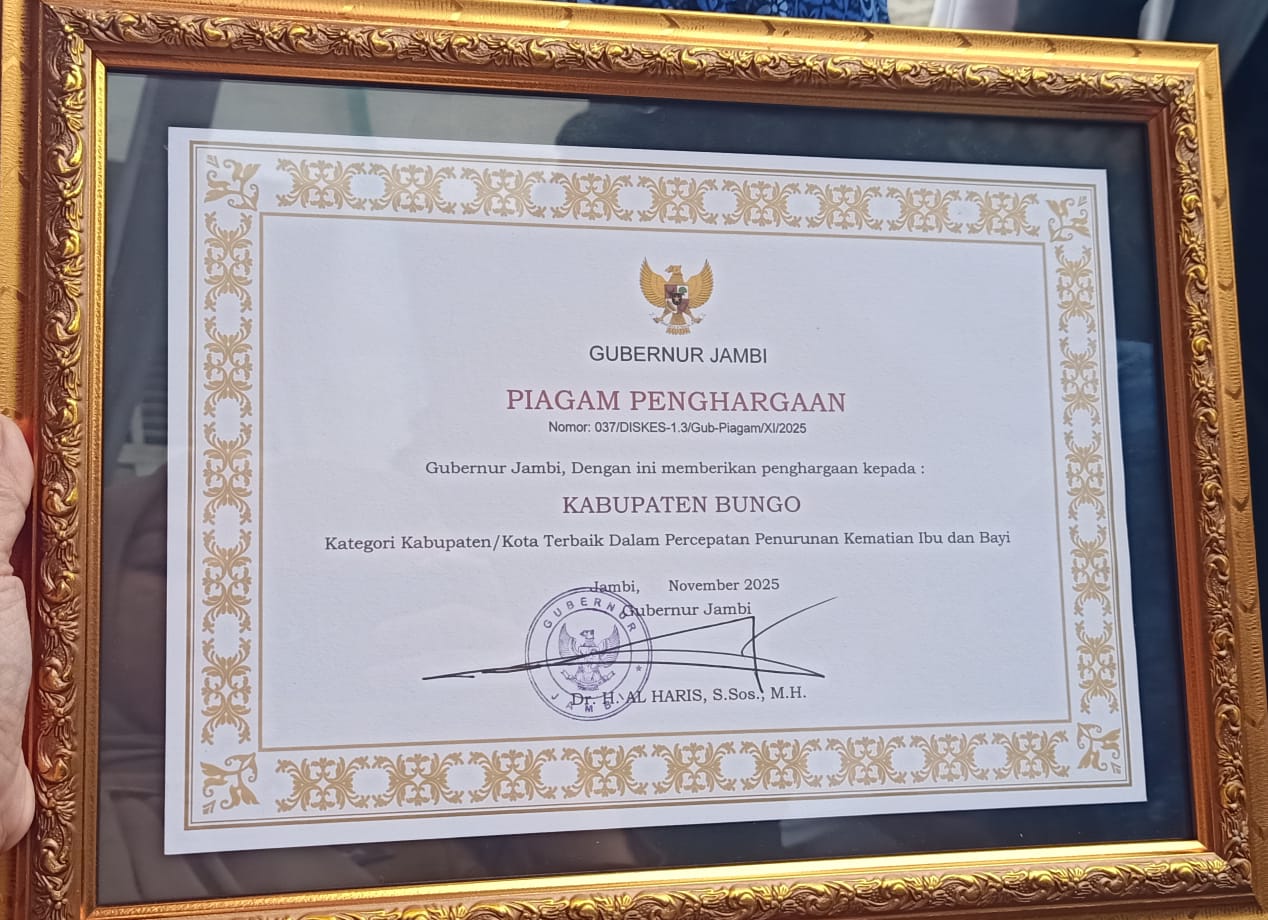 Kabarredaksi.id – Muara Bungo – Dinas Kesehatan Kabupaten Bungo kembali menorehkan prestasi gemilang di tingkat Provinsi Jambi. Pada puncak peringatan Hari Kesehatan Nasional (HKN) ke-61 Provinsi Jambi Tahun 2025, yang digelar di Lapangan Upacara Kantor Gubernur Jambi, Selasa 18 November 2025, Bungo berhasil menyabet empat penghargaan bergengsi sekaligus. Penghargaan ini diserahkan langsung oleh Gubernur Jambi. sebagai bentuk apresiasi atas kinerja dan dedikasi Dinas Kesehatan Bungo dalam meningkatkan kualitas kesehatan masyarakat.