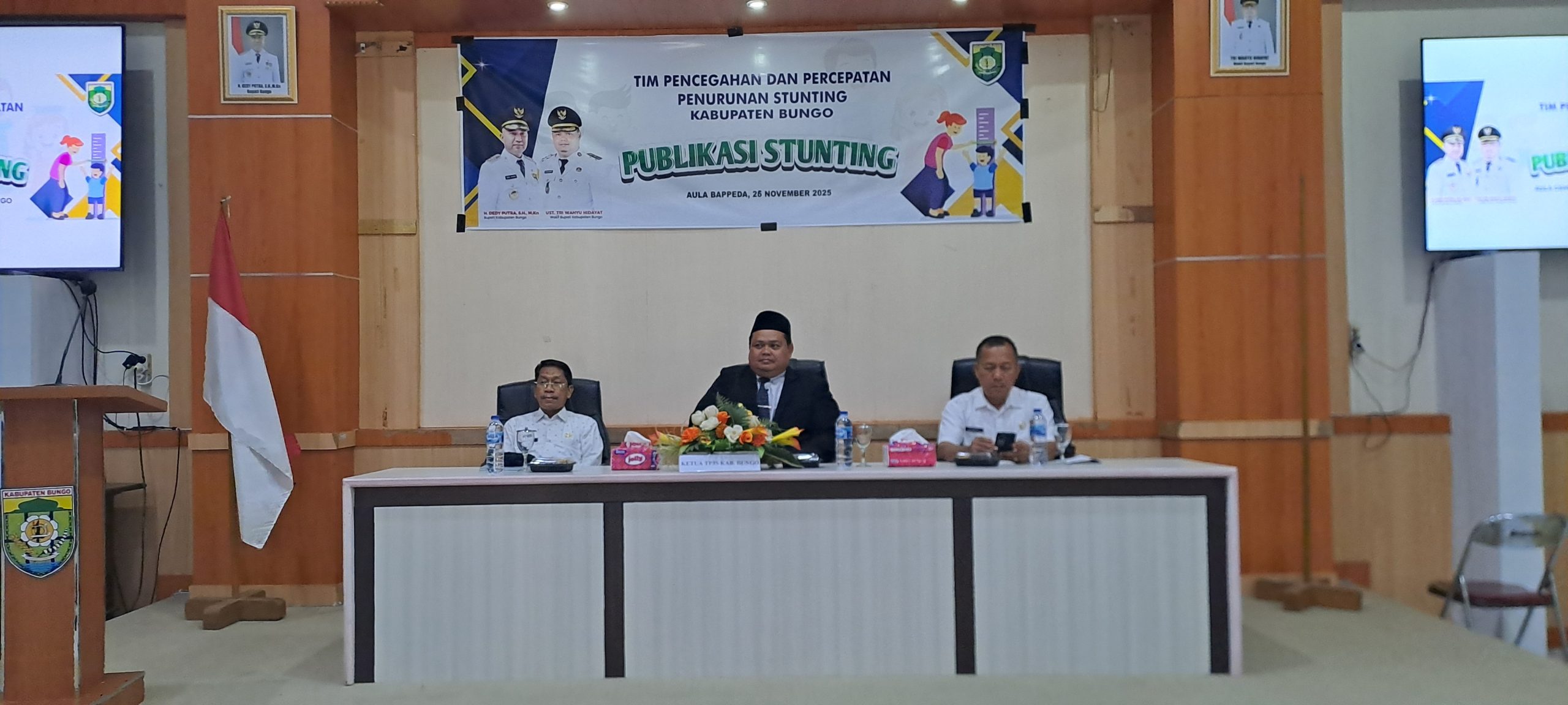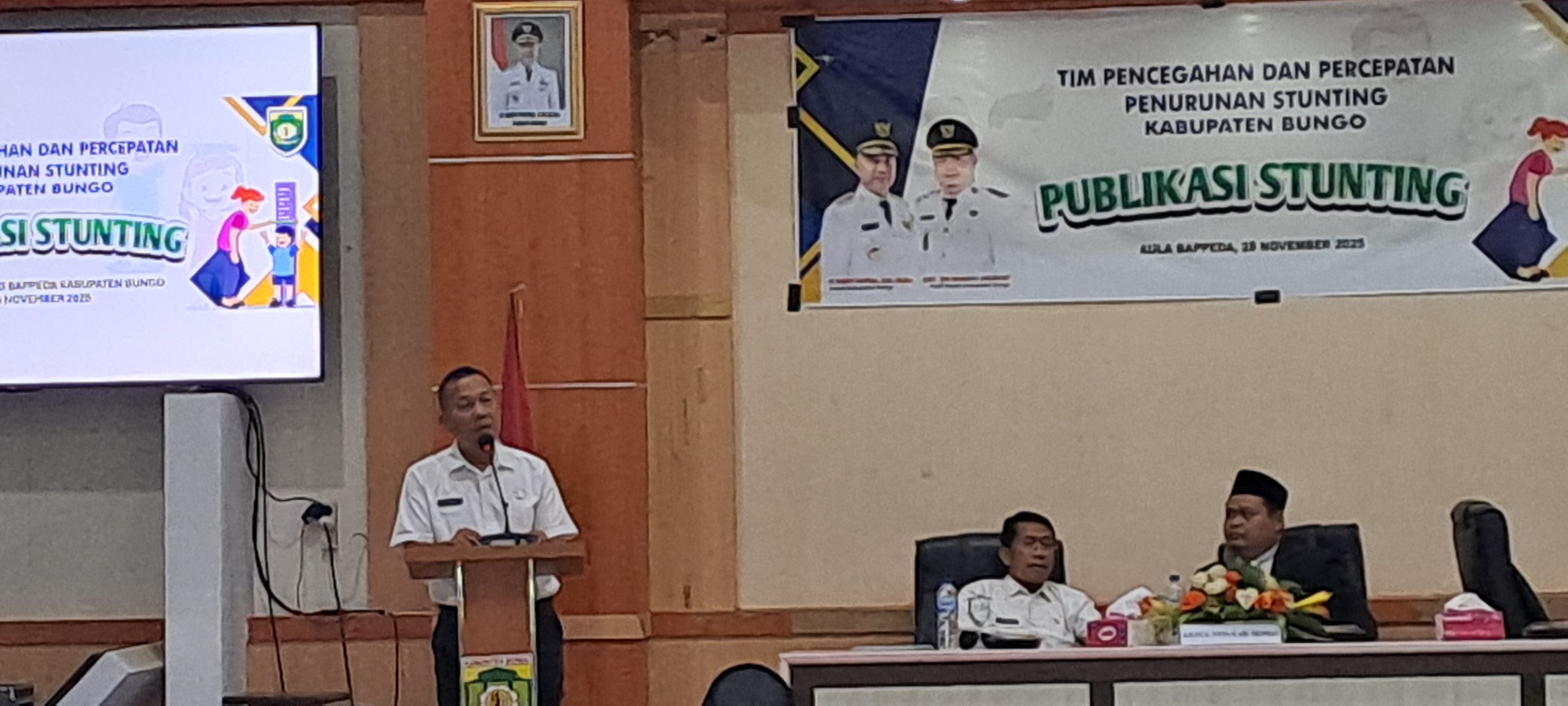 Kabarredaksi.id-Muara Bungo- Dinas Kesehatan, melalui Tim Pencegahan dan Percepatan penurunan Stunting, (TPPS ) menggelar Pertemuan Publikasi Stunting Kabupaten Bungo 2025 pada Rabu (25/11/2025) di Aula Cempaka Kantor Bappeda Bungo. Acara ini dibuka langsung Wakil Bupati Bungo Tri Wahyu Hidayat, dan dihadiri oleh berbagai pemangku kepentingan, termasuk Kadis Kesehatan Safaruddin Matondang,Kaban Bappeda, Dirut RSUD Hanafie serta sejumlah kepala OPD, camat, dan kepala puskesmas.