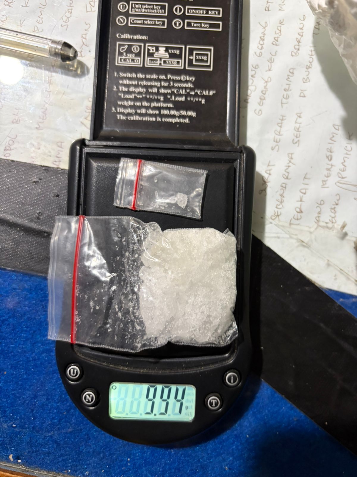Setelah memastikan keberadaan target, petugas kemudian melakukan penangkapan terhadap kedua terduga pelaku. Dari hasil penggeledahan badan dan tempat kejadian perkara yang disaksikan oleh warga setempat, petugas menemukan sejumlah barang bukti berupa satu plastik klip kecil dan satu plastik klip besar berisi kristal bening yang diduga narkotika jenis sabu, yang disimpan dalam kotak rokok dan plastik asoy berbalut tisu.