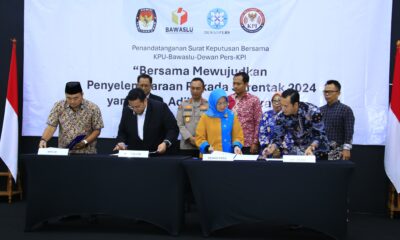 Jakarta. Kadivhumas Polri Irjen. Pol. Sandi Nugroho menghadiri penandatanganan Surat Keputusan Bersama (SKB) KPU, Bawaslu, KPI, dan Dewan Pers. SKB tersebut mengenai pembentukan Gugus Tugas Pemantauan...