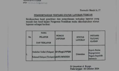 Kabarredaksi.id -MUARA BUNGO – Badan Pengawas Pemilu (Bawaslu) Kabupaten Bungo meneruskan satu laporan atau pengaduan dugaan pelanggaran netralitas Aparatur Sipil Negara (ASN) di lingkungan Pemerintah Daerah...