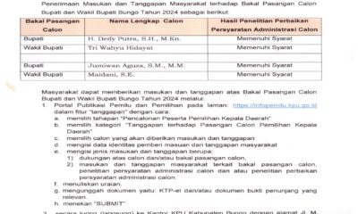 Kabarredaksi.id -Muara Bungo -Komisi Pemilihan Umum (KPU) Kabupaten Bungo menetapkan dua Pasangan Calon (Paslon) Bupati dan Wakil Bupati Pilkada Bungo 2024 pada rapat pleno tertutup, Minggu...